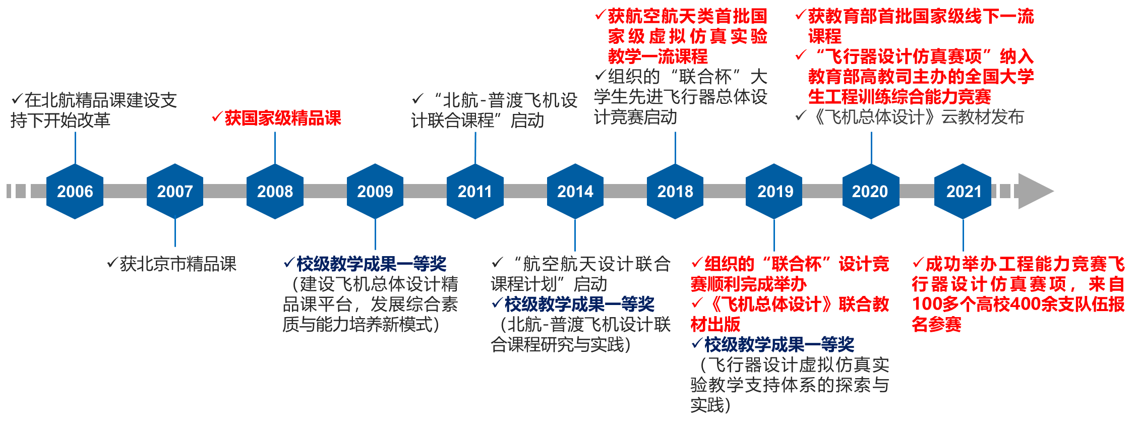 十六年的课程改革取得了持续的成效:2007年获批北京市精品课,2008年获批国家级精品课,2009年、2014年、2019年三次获北航教学成果一等奖。课程组于2018年牵头完成的“隐身飞机探究与设计”获教育部航空航天类首批、北航首个国家虚拟仿真实验教学一流课程。2020年,“飞机总体设计”获批教育部首批国家级线下一流课程。