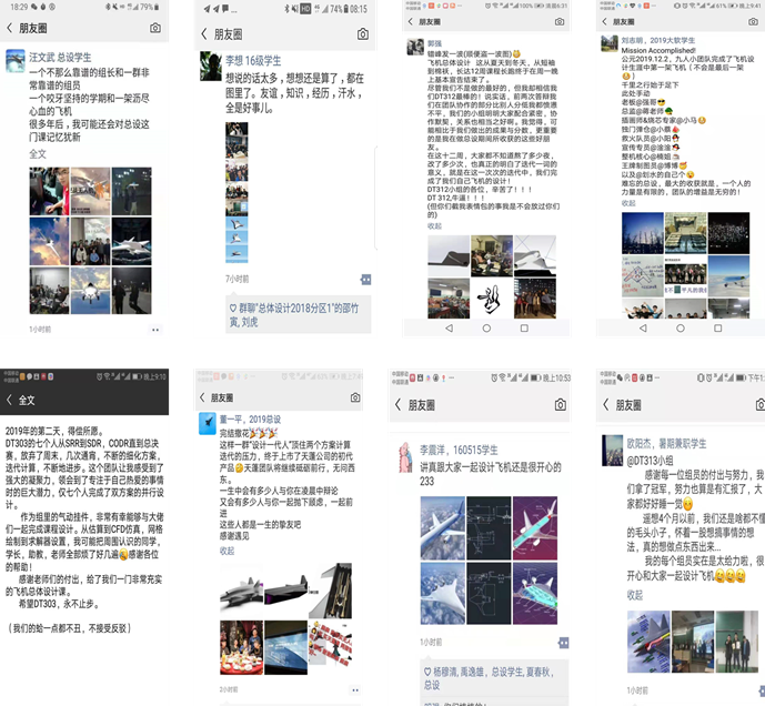 学生结合课堂所学,围绕给定主题分组(每组10人左右)、分类(军机、民机)、分区(三个平行班)开展飞行器方案设计及分析评估,并通过小组间、分区间竞争模式及精细的过程性评分细则,激发学生参与度和积极性。设计项目的命题从自设题目到美国航空航天学会AIAA设计竞赛题目,再到与我国航空工业部门的主机所联合出题。题目类型涉及单通道/宽体大型客机、公务机、反潜机、电动轻型飞机、高超声速飞行器等等。在“飞机总体设计课”中,学生们感悟分享最多的,就是团队的价值与奋斗的收获。