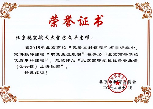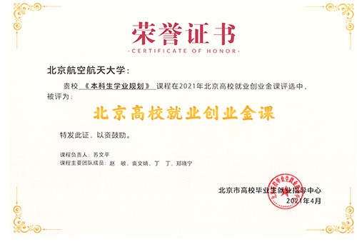 《职业生涯规划》于2008年春季在北航开设为全校选修课,14年来持续授课,被学生誉为“五星级选修课”,获评“2019年北京高校优质本科课程”、“2021年北京高校就业创业金课”。2016年创建北航生涯教育团队;2017年起为大类培养人才改革量身打造本科生学业规划课;目前已建成北航生涯教育系列课程:纵向涵盖了全校本、研各学段,最近学年开课36个班次;横向拓展到沙河高校联盟七校。2015年开发MOOC课程,通过慧科高校邦平台上线,已有180所高校49万人次学习、广泛好评。