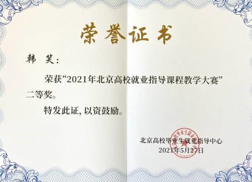 图3.教学团队成员荣获“2021北京高校就业指导课程教学大赛”二等奖