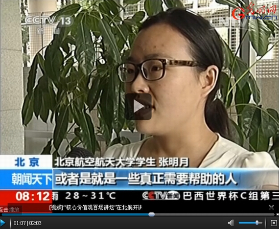 【同期】北京航空航天大学学生 张明月:在社会生活中,如果我们能心里想着这个核心价值观,就不会出现一些比如说老人倒了没有人扶,或者是就是一些真正需要帮助的人,然后别人都是冷眼旁观,我觉得这是一个,就是公民的基本的道德准则。