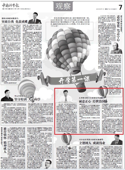 编者按:2014年9月11日《中国科学报》的“观察”版摘发了6位大学校长在2014级本科生开学典礼上的讲话,其中包括我校校长怀进鹏院士在2014级本科生开学典礼上的讲话,北航新闻网全文转发,以飨读者。