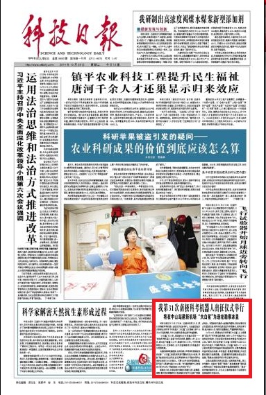 《科技日报》2014年10月28日头版(记者林莉君)报道:我第31次南极科考机器人出征仪式举行