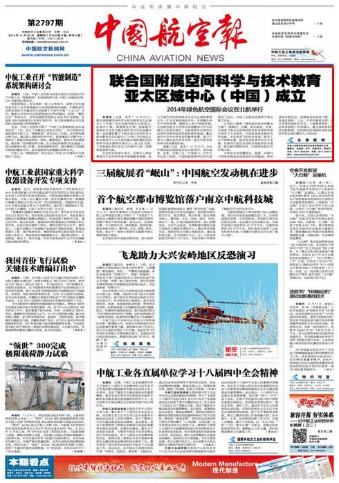 《中国航空报》2014年11月20日头版(记者 马宁)报道:联合国附属空间科学与技术教育亚太区域中心(中国)成立 2014年绿色航空国际会议在北航举行