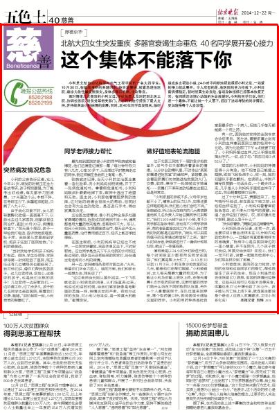 编者按:近日,我校自动化科学与电气工程学院一名大四学生在备战考研的关键时期突发重病,身体多器官衰竭,生命垂危,学校和学院领导高度关注,近40位同学临时组成多支帮助小组,24小时不间断地帮助照顾,一场爱的接力就此展开?!侗本┩肀ā芳钦吡趿詹尚赐ㄑ侗ǖ来耸?,文章刊发于2014年12月22日的《北京晚报》。北航新闻网现全文转载。以飨读者。