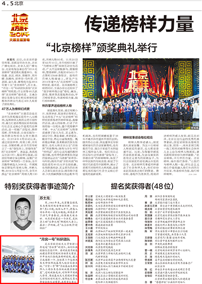 《北京晚报》2015年1月6日报道“北京榜样”颁奖典礼举行,显著位置报道我校“月宫一号”团队事迹。新闻网全文转发,以飨读者。