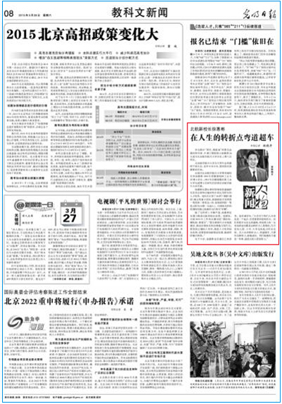 编者按:2015年3月28日,《光明日报》“新闻人物”栏目以《北航新校长徐惠彬:在人生的转折点弯道超车》为题,报道我校校长徐惠彬院士履新任职。