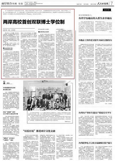 《人民政协报》2015年3月28日(孙权)报道:两岸高校首创双联博士学位制