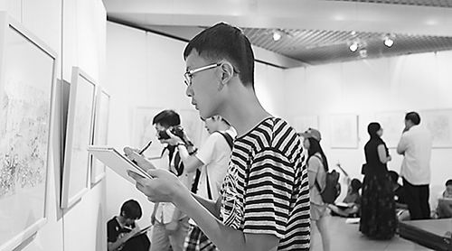 图为开幕式上驻足欣赏画作的学生。通讯员 余敏 摄影