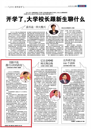 《北京晨报》2015年9月17日摘发我校校长徐惠彬院士在2015级研究生开学典礼上的讲话“创新不是漫无目的的改变”,北航新闻网现全文转载,以飨读者。