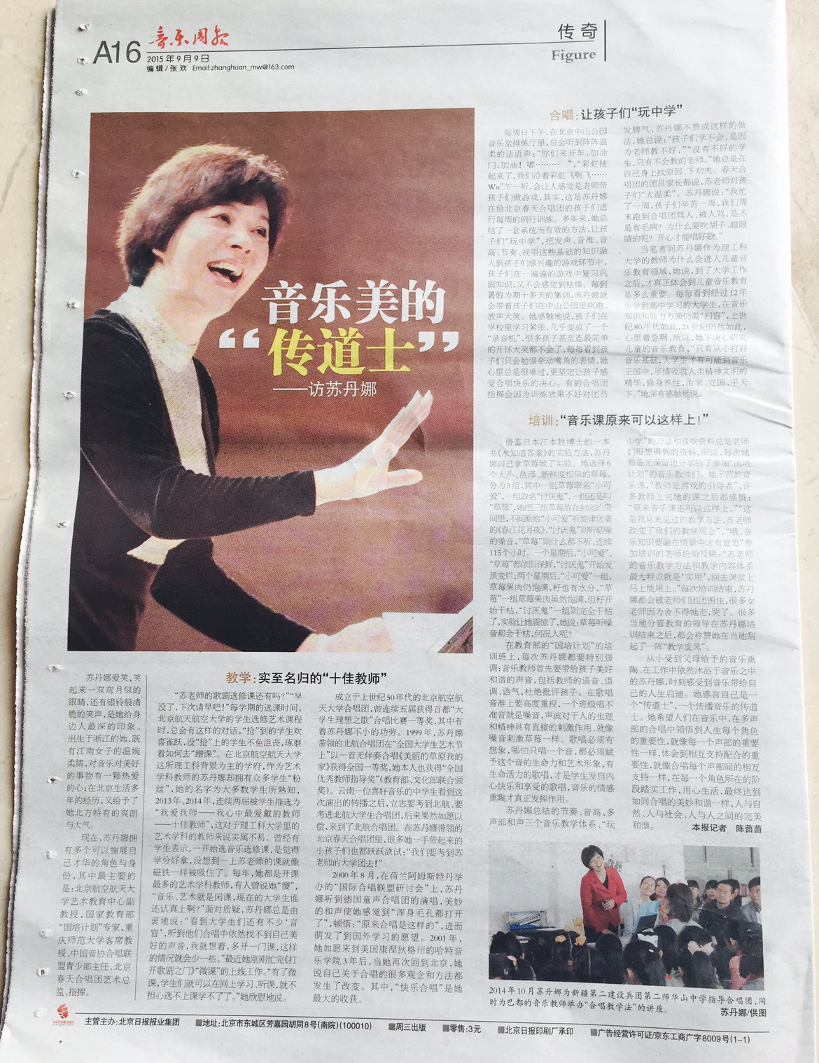 “苏老师的歌剧选修课还有吗?”“早没了,下次请早吧!”每学期的选课时间,北京航空航天大学的学生选修艺术课程时,总会有这样的对话,“抢”到的学生欢喜雀跃,没“抢”上的学生不免沮丧,琢磨着如何去“蹭课”。在北京航空航天大学这所理工科背景为主的学府,作为艺术学科教师的苏丹娜却拥有众多学生“粉丝”,她的名字为大多数学生所熟知,2013年、2014年,连续两届被学生推选为“我爱我师——我心中最爱戴的教师——十佳教师”,这对于理工科大学里的艺术学科的教师来说实属不易。曾经有学生表示,一开始选音乐选修课,是觉得学分好拿,没想到一上苏老师的课就像磁铁一样被吸住了。每年,她都是开课最多的艺术学科教师,有人曾说她“傻”,“音乐、艺术就是闲课,现在的大学生谁还认真上???”面对质疑,苏丹娜总是由衷地说:“看到大学生们还有不少‘音盲’,听到他们合唱中依然找不到自己美好的声音,我就想着,多开一门课,这样的情况就会少一些?!弊罱崭彰ν辍洞蚩杈缰拧贰拔⒖巍钡纳舷吖ぷ??!坝辛宋⒖?,学生们就可以在网上学习、听课,就不担心选不上课学不了了?!彼牢康厮?。