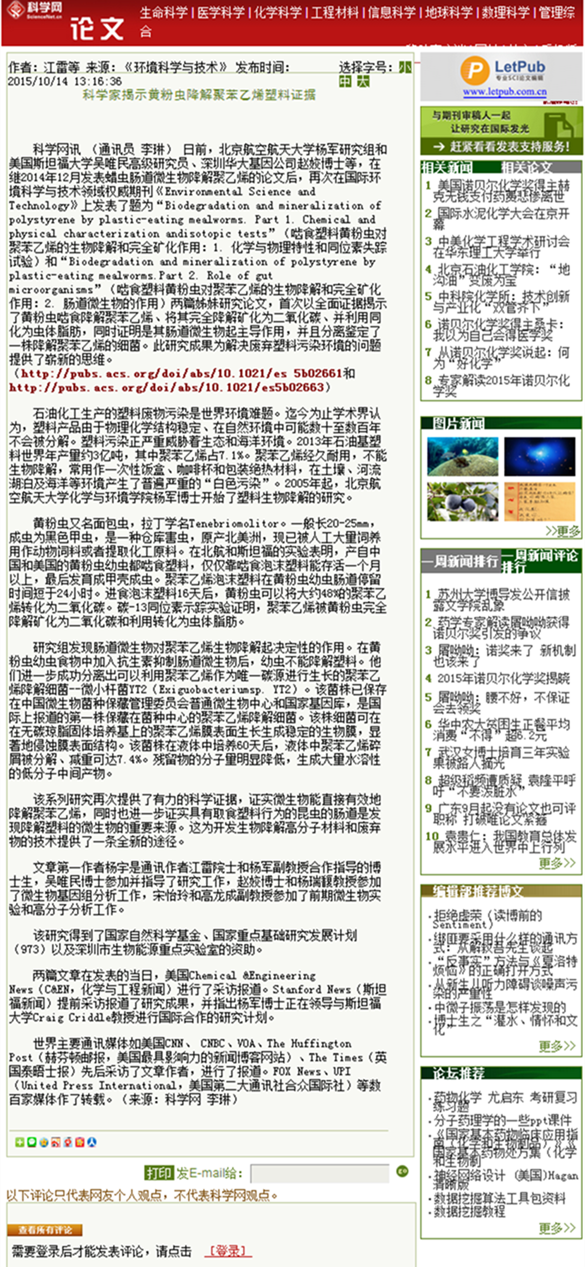 科学网讯 (通讯员 李琳) 日前,北京航空航天大学杨军研究组和美国斯坦福大学吴唯民高级研究员、深圳华大基因公司赵姣博士等,在继2014年12月发表蜡虫肠道微生物降解聚乙烯的论文后,再次在国际环境科学与技术领域权威期刊《Environmental Science and Technology》上发表了题为“Biodegradation and mineralization of polystyrene by plastic-eating mealworms. Part 1. Chemical and physical characterization andisotopic tests”(啮食塑料黄粉虫对聚苯乙烯的生物降解和完全矿化作用:1. 化学与物理特性和同位素失踪试验)和“Biodegradation and mineralization of polystyrene by plastic-eating mealworms.Part 2. Role of gut microorganisms”(啮食塑料黄粉虫对聚苯乙烯的生物降解和完全矿化作用:2. 肠道微生物的作用)两篇姊妹研究论文,首次以全面证据揭示了黄粉虫啮食降解聚苯乙烯、将其完全降解矿化为二氧化碳、并利用同化为虫体脂肪,同时证明是其肠道微生物起主导作用,并且分离鉴定了一株降解聚苯乙烯的细菌。此研究成果为解决废弃塑料污染环境的问题提供了崭新的思维。(http://_mediafile/news/pubs.acs.org/doi/abs/10.1021/es 5b02661和http://_mediafile/news/pubs.acs.org/doi/abs/10.1021/es5b02663)