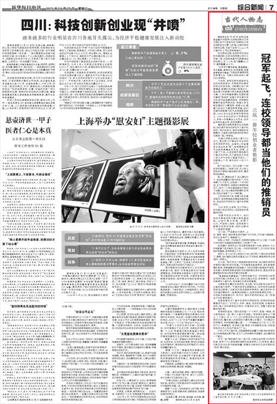 编者按:《 新华每日电讯》2015年10月27日以《北航一群年轻创业者剪影——冠军起飞,连校领导都当他们的推销员》为题,报道在首届中国“互联网+”大学生创新创业大赛中获得总冠军的我校学生创新创业团队事迹。