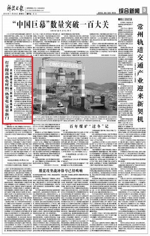 编者按:《科技日报》2015年11月29日以《打开提高热电材料“热变电”效率新门 北航教授论文被<科学>在线发表》为题刊发我校赵立东教授等学者在热电能源材料硒化锡应用方面的突破性研究成果。