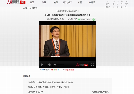 2016年1月8日,人民网“科技频道”在“国家科技奖获奖人谈成果”专题刊发了采访我校王云鹏教授关于“车辆联网感知与智能驾驶服务关键技术及应用”的视频。