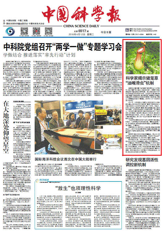 《中国科学报》2016年4月12日头版报道《自然》刊发北航教授仿生表面重要研究进展: