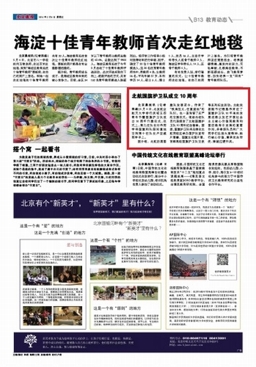 北京晨报讯(记者 郑超)5月4日,北京航空航天大学举行庆祝五四青年节暨国旗护卫队成立10周年升旗仪式,仪式上,第九任队长付伟同学将国旗和队服郑重地交到第十任队长卢亚威同学手上。