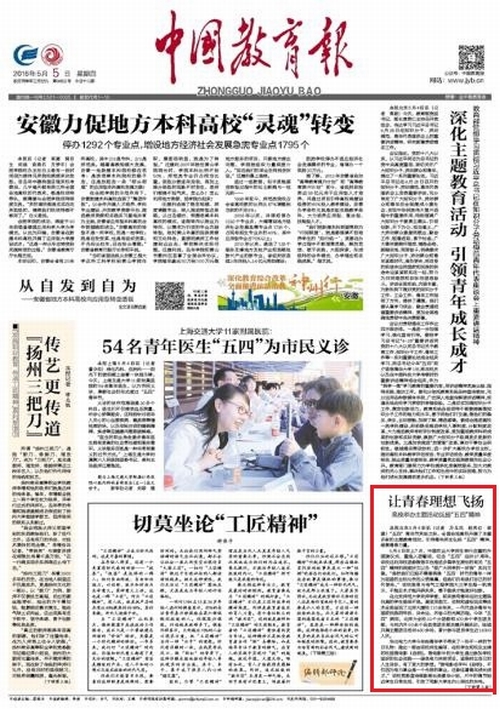 《中国教育报》2016年5月5日头版(记者 万玉凤 赵秀红 柴葳)报道: