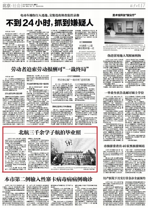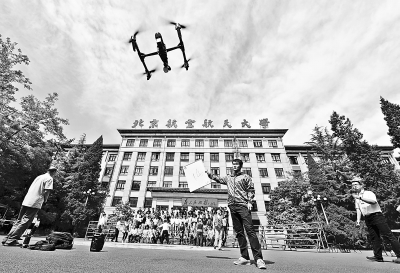 本报讯(记者 任敏)昨天,北京航空航天大学3400多位本科生拍摄毕业照,学校首次启用四旋翼无人机进行航拍,为毕业生定格青春。