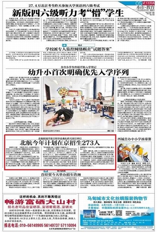 《北京青年报》2016年6月19日(记者 王晓芸)报道北航今年计划在京招生273人: