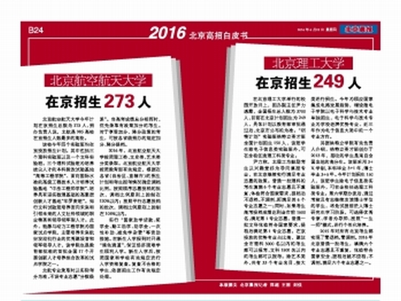 《北京晨报》2016年6月23日报道北京航空航天大学在京招生273人:
