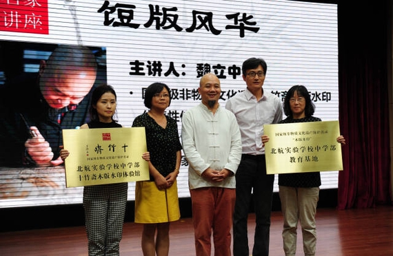 当日,国家级非物质文化遗产传承人、杭州十竹斋艺术馆馆长魏立中来到北航实验学校中学部,为该校师生做题为《饾版风华——国家级非物质文化遗产十竹斋木版水印艺术》讲座。“国家级非物质文化遗产?;っ?lsquo;木版水印’北航实验学校中学部教育基地”授牌仪式也于当日举行。