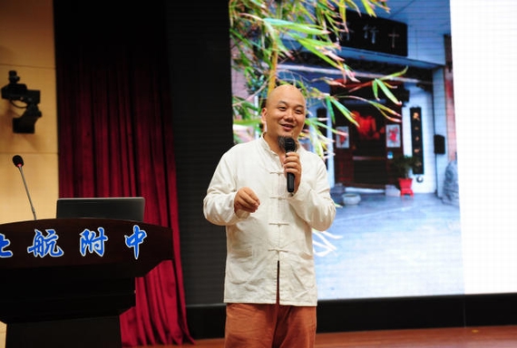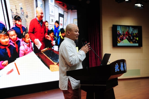 9月12日,国家级非物质文化遗产传承人、杭州十竹斋艺术馆馆长魏立中(中)在北航实验学校中学部为该校师生做题为《饾版风华——国家级非物质文化遗产十竹斋木版水印艺术》讲座。