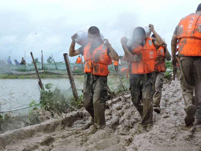 在灾区,战士们负责用沙袋加固堤坝。在和洪水的斗争中,他们浑身上下沾满了泥巴,新华社发。