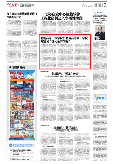 《中国航空报》2016年11月8日报道北航高等工程学院更名为高等理工学院并冠名“沈元荣誉学院”: