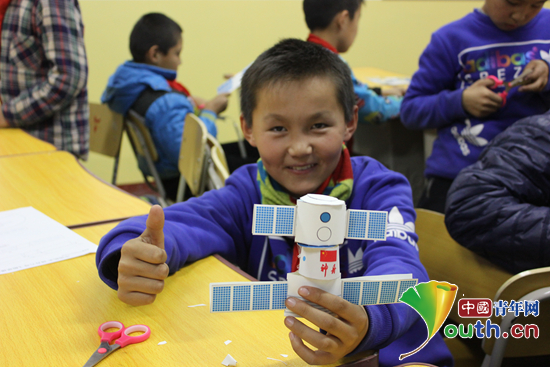 托普铁热克乡小学的学生为自己亲手制作的飞船纸模点赞。杨意洽 供图