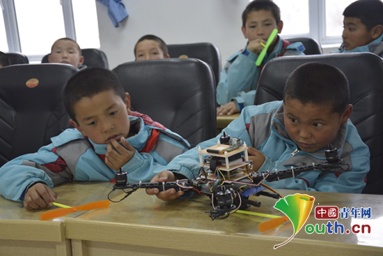 图为吉木乃县小学学生好奇地摆弄小飞行器。杨意洽 供图