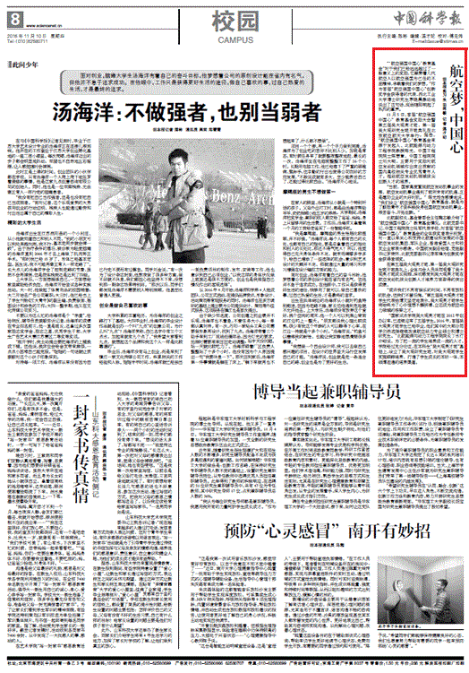 《中国科学报》2016年11月10日报道首届“航空强国中国心”教育基金奖励大会暨第五届吴大观英才班、第一届吴大观研究生班开班典礼在北航举行:
