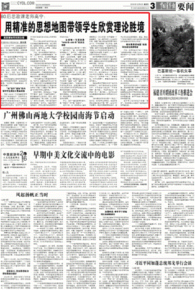 《中国青年报》2016年12月8日要闻版头条报道我校马克思主义学院80后思政课老师高宁:用精准的思想地图带领学生欣赏理论胜境