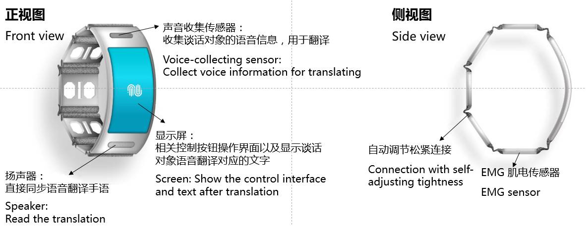 这两个姑娘开始着手研究手语翻译的可行性,查论文、做实验、写代码,用冯如杯一等奖奖金5万元作为启动资金行动了起来。因为不能随时携带摄像头,图像识别被否决了;因为太引人注意,手套被否决了。最终确定了通过臂环捕捉肌电信号的方法。因为随着智能手表的逐渐普及,失语者带着臂环看上去也并不突兀?;扑堑?,他们曾经专门做过“体验一天失语者”的活动。在便利店,因为结账时需要了解价格,失语者只能通过手机和店员沟通,时间稍长排队在后面的人开始不耐烦地催促,“如果别人知道我是失语者可能会体谅,但不知道就会埋怨,越埋怨我越着急。”一些失语者不愿意别人称呼他们为“聋人”,自己会写成“龙人”。