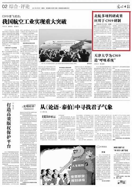 《光明日报》2017年5月6日报道北航多项科研成果应用于C919研制: