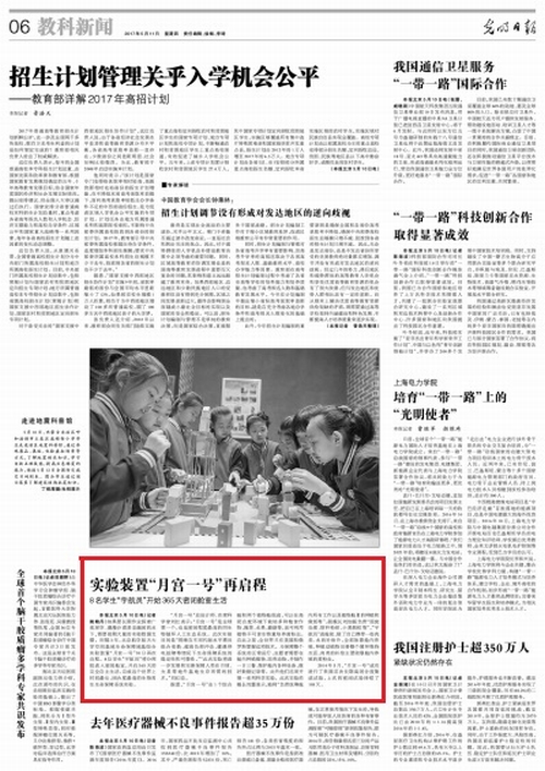 《光明日报》2017年5月11日报道实验装置“月宫一号”再启程: