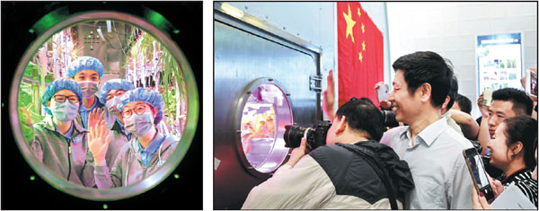 The first group of four volunteers (at left) greet people through the window of the airtight laboratory in Beihang University in Beijing on Wednesday. In photo at right, Xu Huibin (center), president of the university, waves back to the graduate students taking part in the life-support experiment.Kong Xiangming / For China Daily.