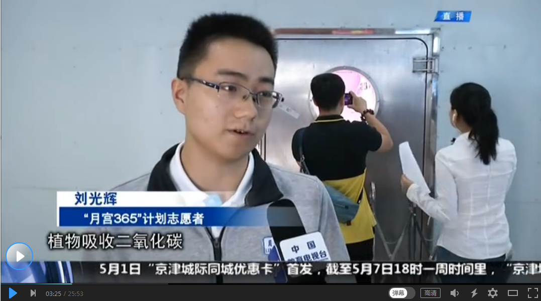 【同期】“月宫365”计划志愿者 刘光辉:植物吸收二氧化碳,产生氧气,供给人呼吸,人呼出的二氧化碳再循环给植物,水是植物蒸腾出来的水,冷凝之后经过净化可以给人饮用,生活污水等等通过处理之后再供给植物。