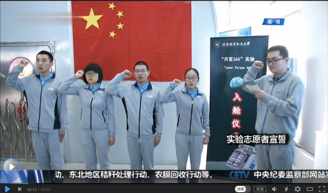 【同期】实验志愿者宣誓:服从命令,听从指挥,遵守保密规定,遵守安全操作规则,团结协作,吃苦耐劳,胆大心细,克服困难,无私奉献,努力保证圆满完成“月宫365”实验任务。