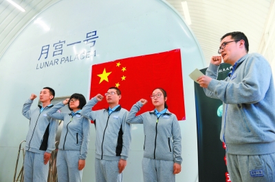 “我,爱祖国,爱航天,爱北航,爱团队,自愿作为‘月宫365’舱内实验志愿者。”昨天,在植物舱Ⅱ外,在五星红旗下,8名大学生志愿者举起右拳,庄严宣誓,他们以响亮的誓言表达决心:“为实现中华民族的航天强国梦不懈奋斗!”