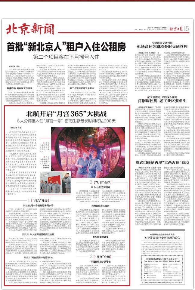 8人分两批入住“月宫一号” 密闭生存最长时间将达200天