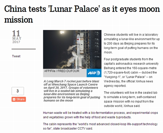 Four postgraduate students from the capital's astronautics research university Beihang entered the 160-square-metre (1,720-square-foot) cabin -- dubbed the "Yuegong-1", or "Lunar Palace" -- on Wednesday, the official Xinhua news agency reported.