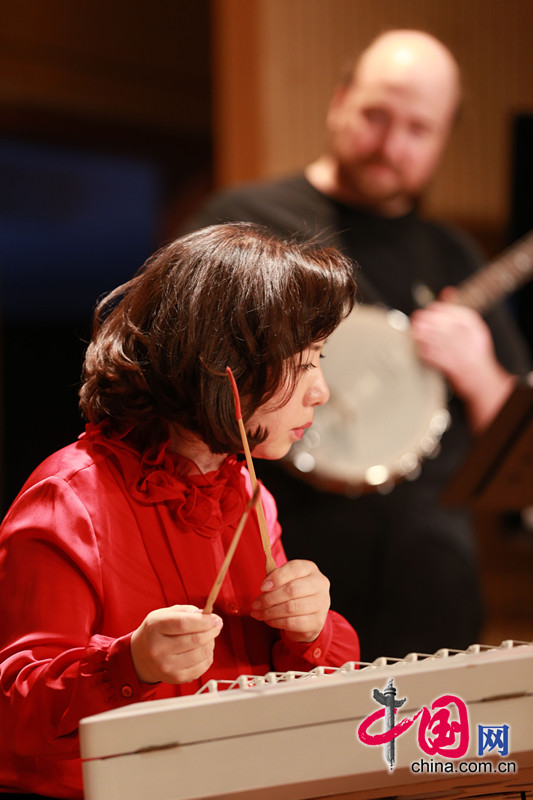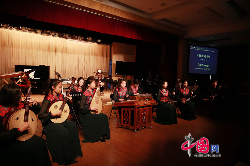 刘月宁向观众们介绍了“新丝路探索者”的成立初衷,及“中美音乐文化分享之旅”概况,并与美国青年扬琴演奏家大卫一起,对比介绍了中美扬琴的特点与风格,随后,音乐家们演奏了多首融合了中美音乐元素的创新作品,以及根据中国脍炙人口的名曲《二泉映月》和云南民歌《小河淌水》创作的全球首演作品《二泉听月》、《琴弦和鸣》。动感的节奏,融合东西方韵味的独特风格,让留学生们露出了情不自禁的微笑,随着节拍轻轻摇摆哼唱起来。北航学生民乐团演奏的《快乐的夜晚》、《敦煌新语》,则让“新丝路探索者”乐队的美国音乐家们对中国综合类大学的艺术教育水平、对中国当代大学生的艺术修养表示由衷赞赏。