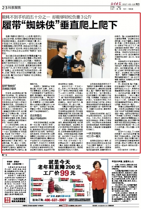 《北京晚报》2017年5月18日(记者 张航)报道我校学生的科技成果:
