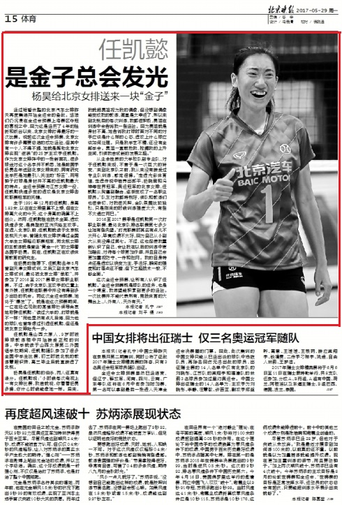 《北京晚报》2017年5月29日以“是金子总会发光”为题报道我校女排队员任凯懿,并赞誉我校女排教练杨昊给北京女排送来一块“金子”: