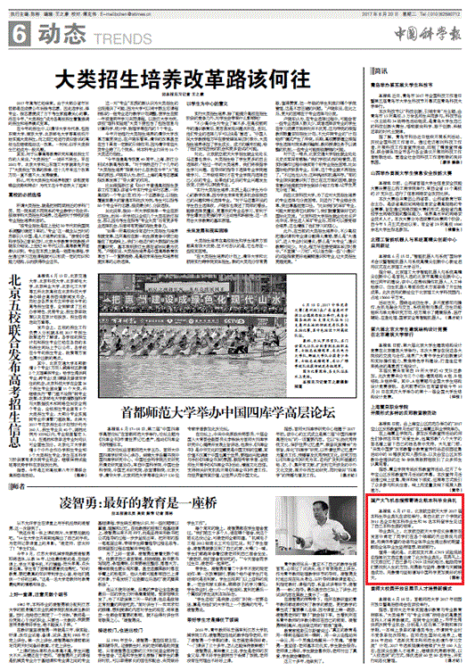 《中国科学报》2017年6月20日报道国产大飞机总指挥寄语北航本科毕业典礼: