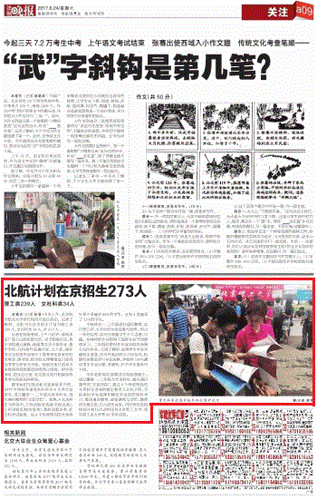 《法制晚报》2017年6月24日(记者张丽)报道北航计划在京招生273人: