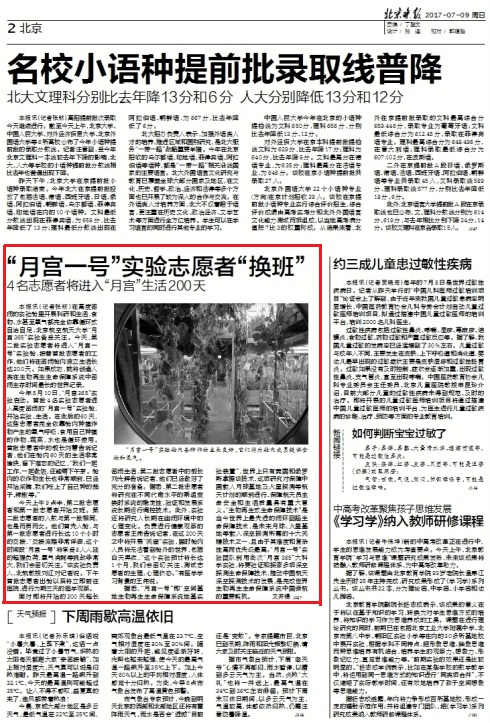 《北京晚报》2017年7月9日报道我校“月宫一号”实验志愿者“换班”: