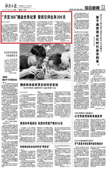 《科技日报》2017年7月10日报道我校“月宫365”计划: