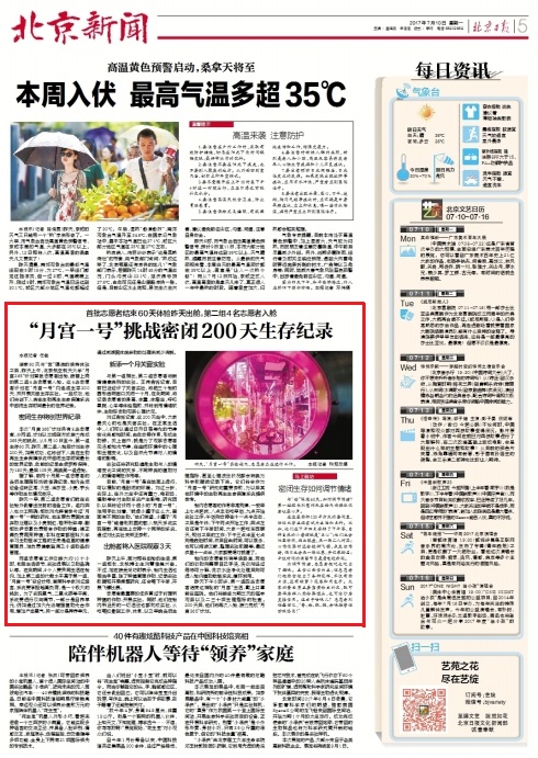 《北京日报》2017年7月10日报道我校“月宫一号”首批志愿者出舱: